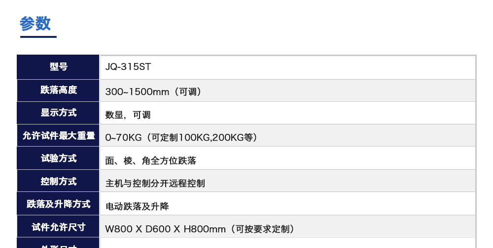 產(chǎn)品型號:JQ-315ST 品牌:劍 喬 用途:動力電池跌落試驗機主要用于評估各類鋰電池及鎳電池等其他一次電池,二次電池,蓄電池單體或電池組自由跌落(例如從臺面頂部)的安全性能。電池以不爆炸不起火為合格。咨詢熱線:13829135130