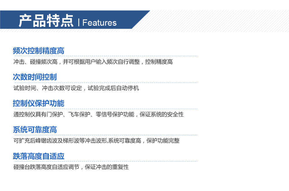 用途:機械碰撞試驗臺模擬仿真裝備及組件在使用與運輸過程中,可能遭遇的沖擊效應為主,并透過沖擊波于瞬間瞬時能量交換,分析產品承受外界沖擊環境之能力,試驗之目的在于了解其機